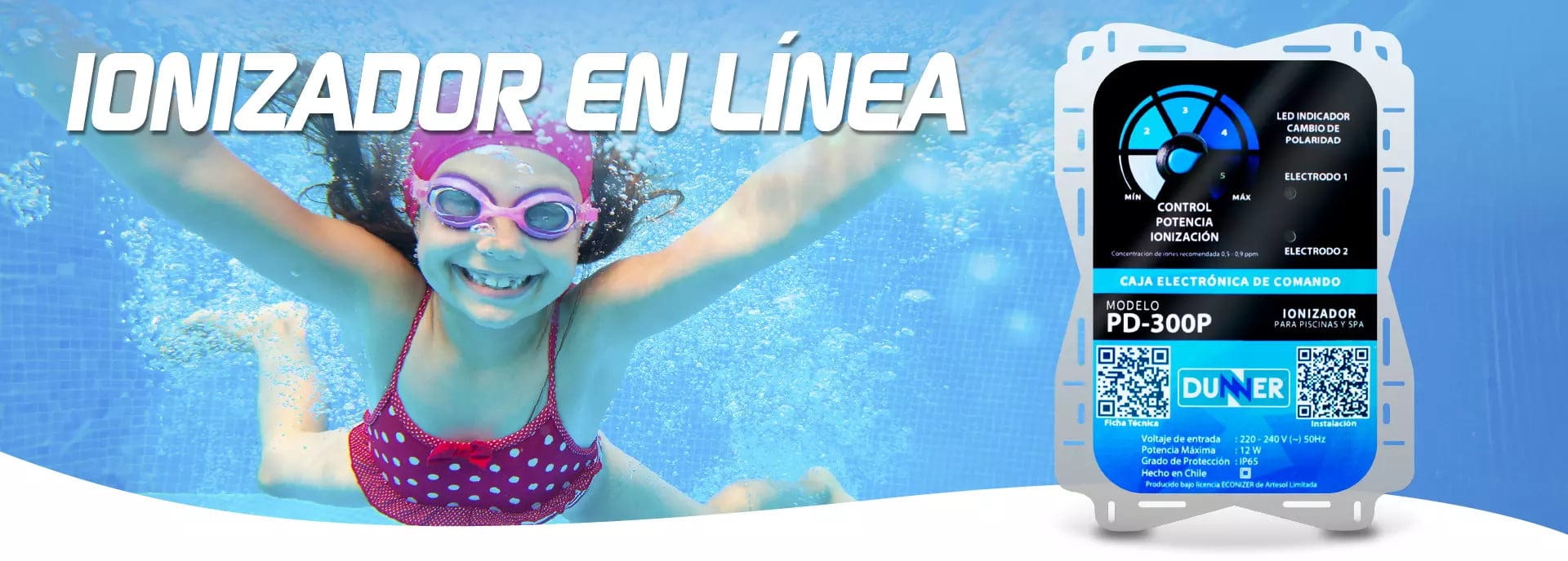 Ionizador en línea para piscinas con un rango máximo de 70 M3, equivalente a una piscina de 8 x 4 x 1.8 mts. que permite dosificar en forma fácil y precisa la cantidad de iones que se quiere mantener en el agua.