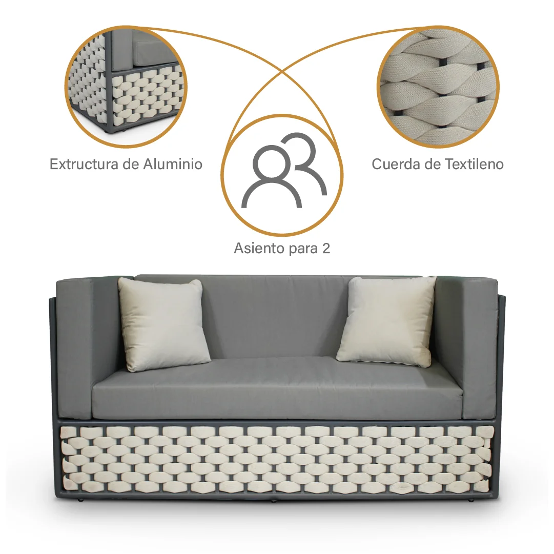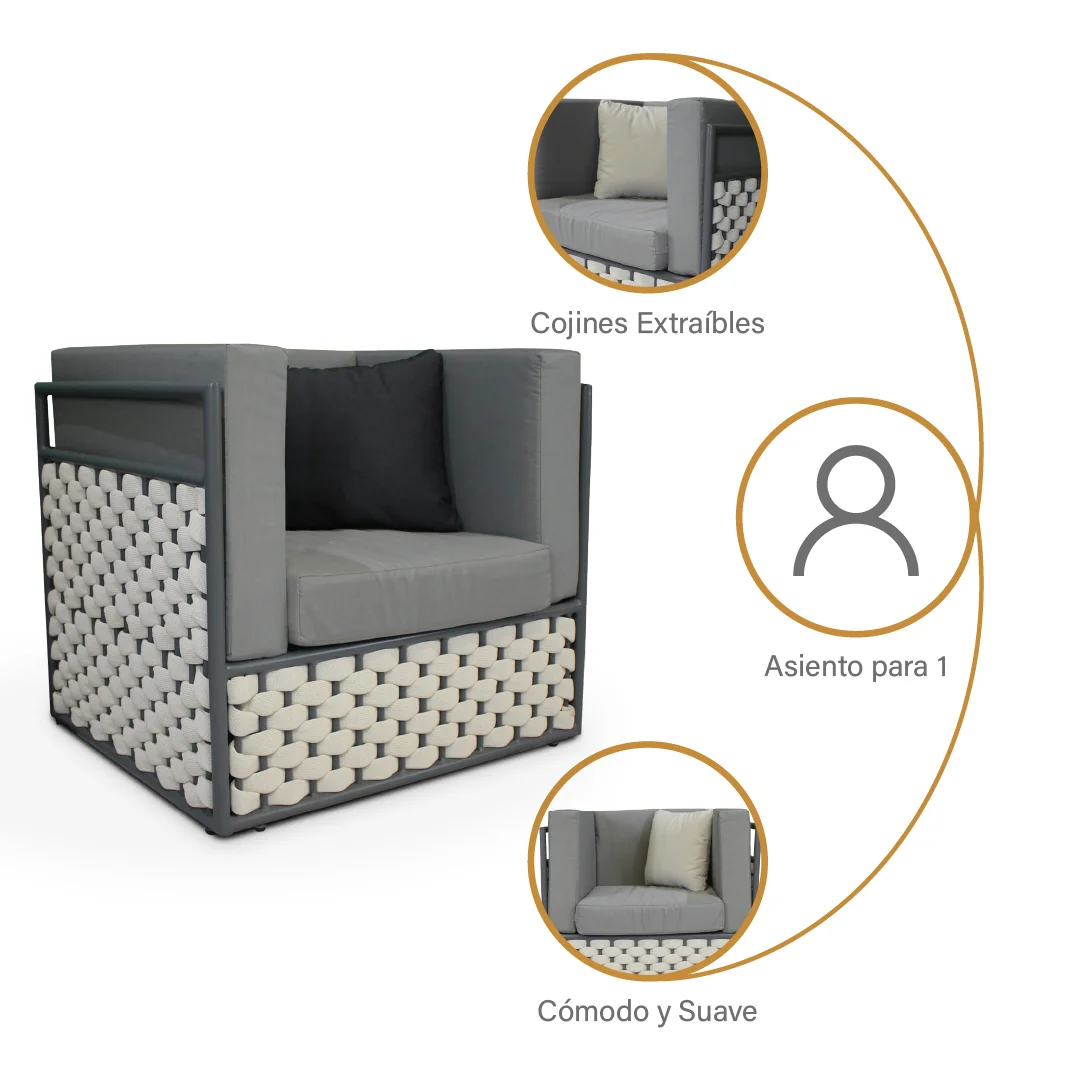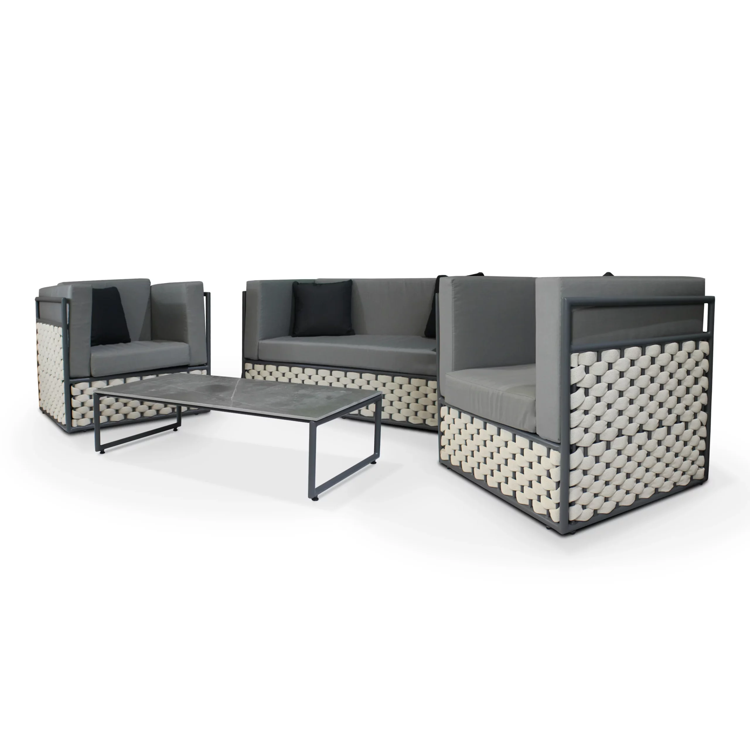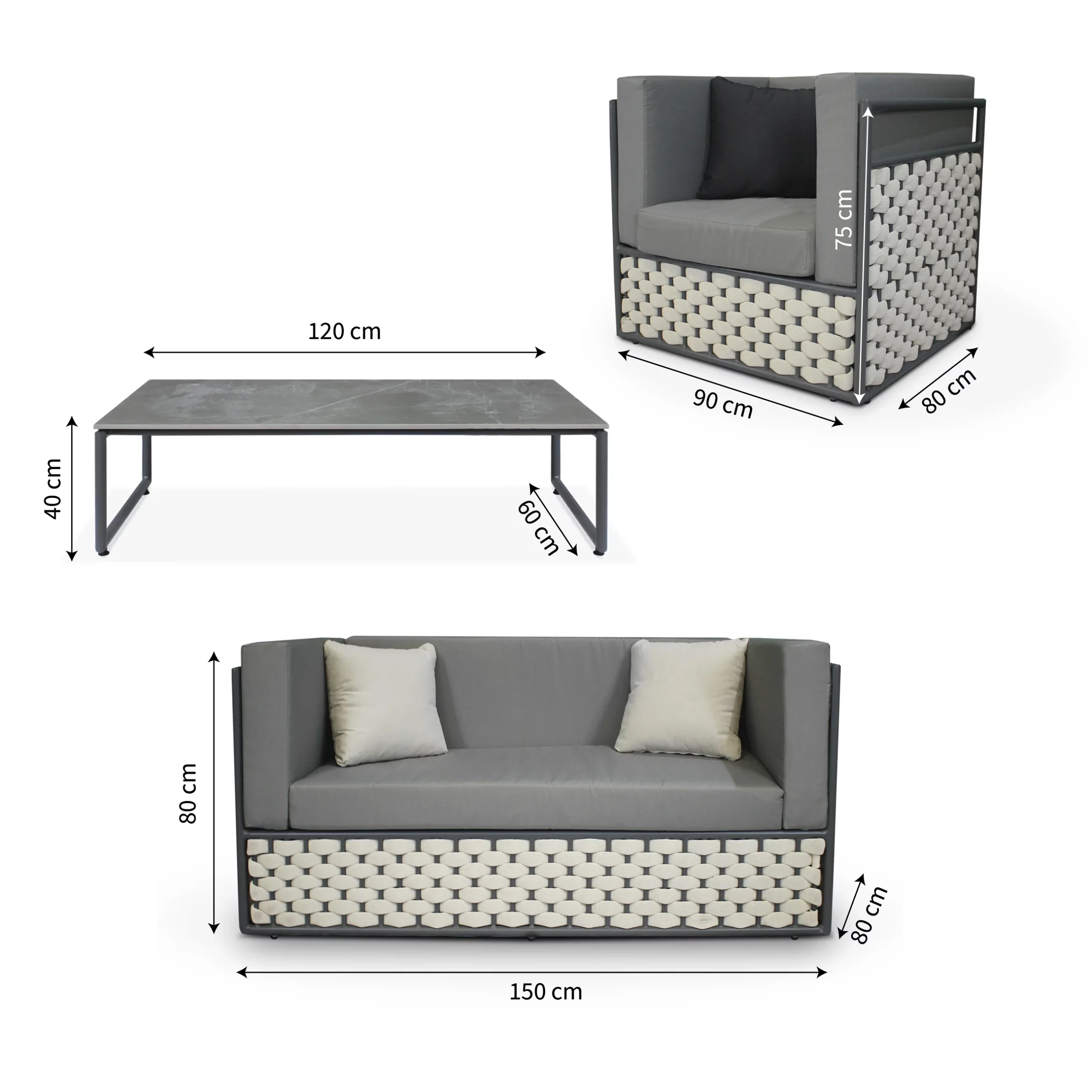 Con una apariencia elegante y delicada, este juego de sofás de 4 piezas con cuerdas tejidas en textileno parece encantador y accesible sin importar qué eventos al aire libre se organicen. Estos sofás para exteriores están tejidos con una cuerda gruesa alrededor del marco de metal electro pintado. Fabricado por artesanos expertos. Las dimensiones del juego de terraza armado son 370cm x 180cm x 75cm aproximadamente. Esta compuesto por un sofá, dos (2) sillas y una (1) mesa.