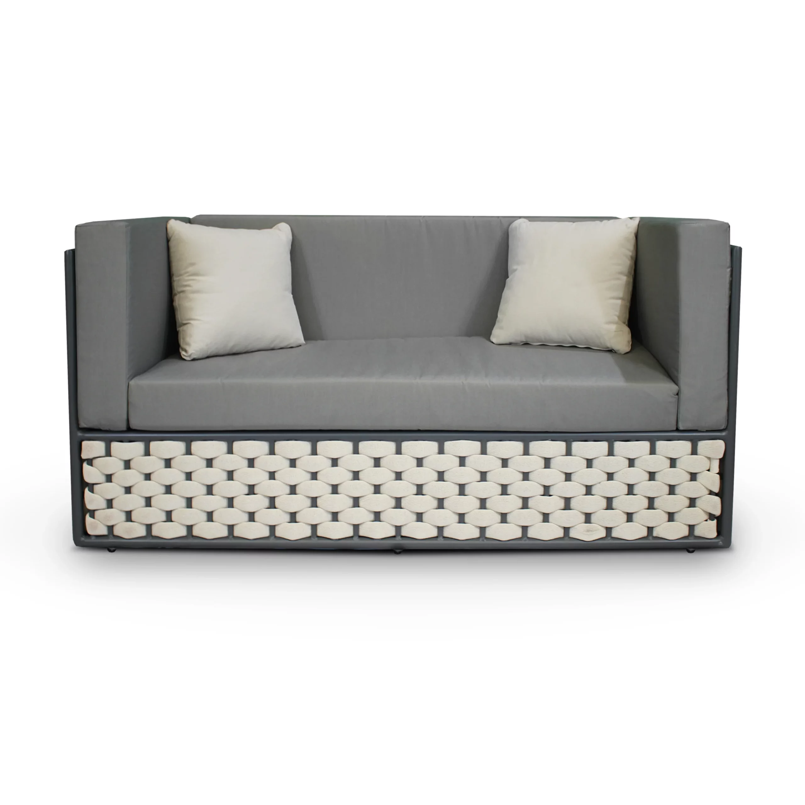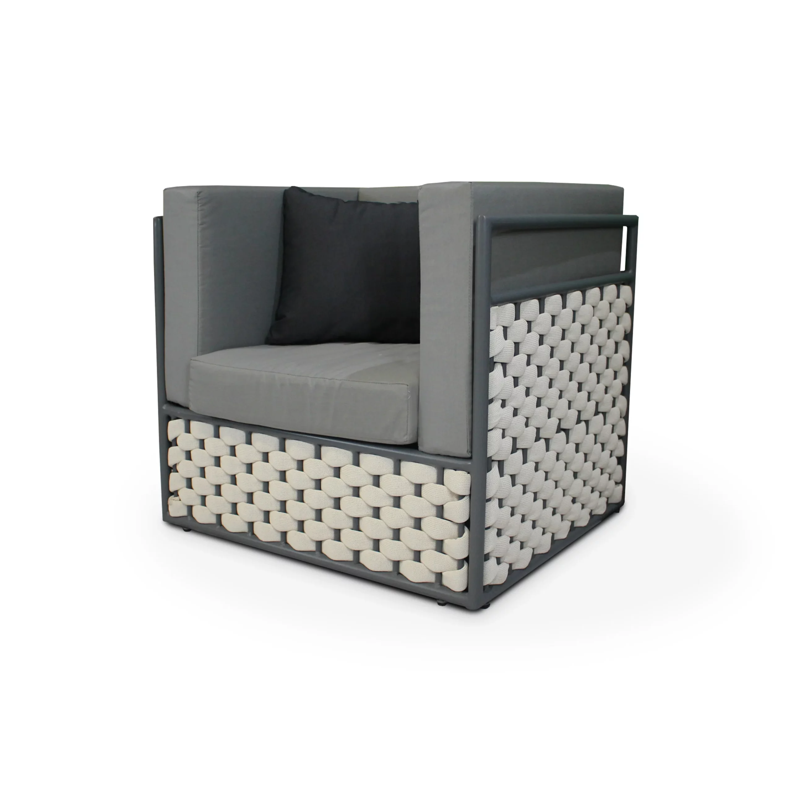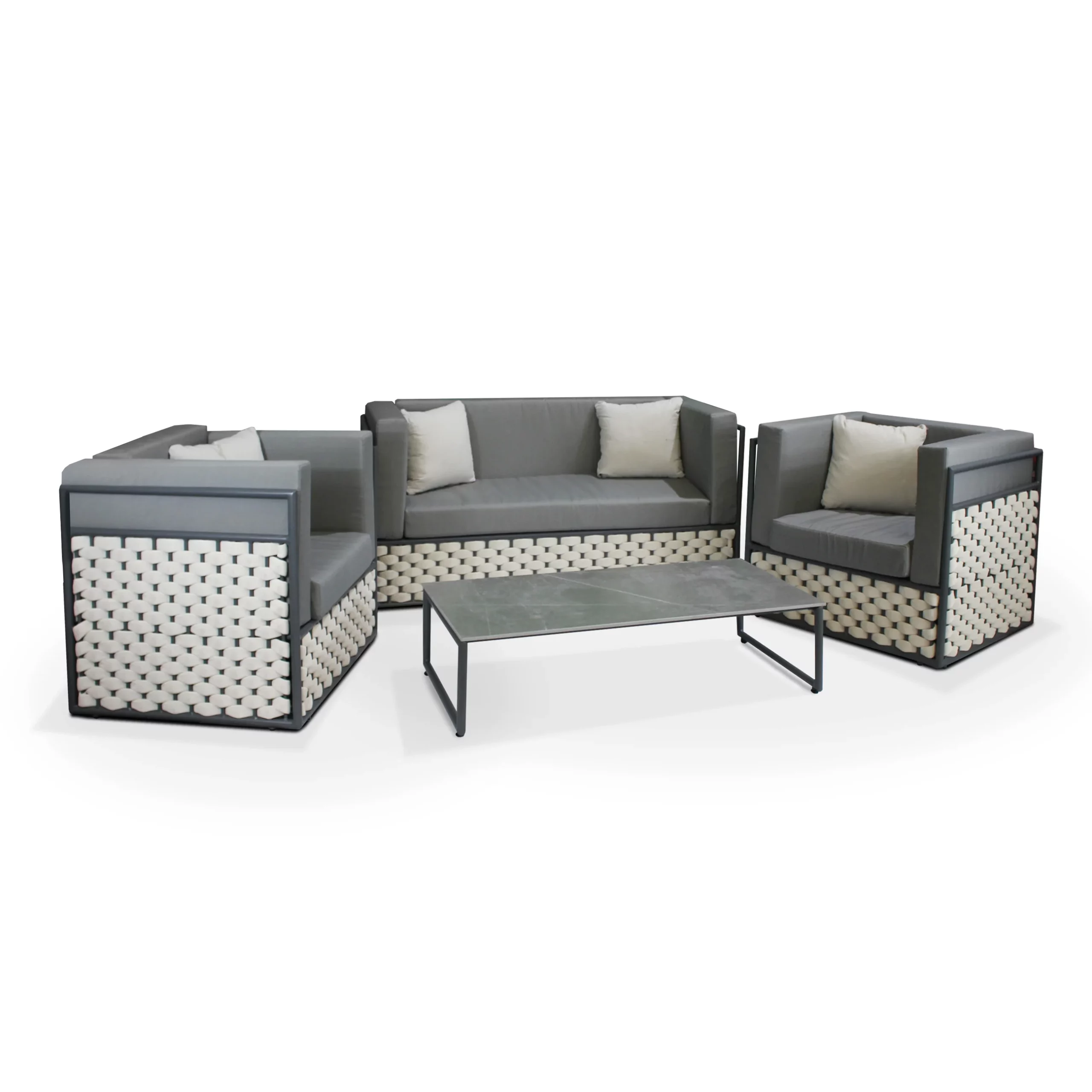 Con una apariencia elegante y delicada, este juego de sofás de 4 piezas con cuerdas tejidas en textileno parece encantador y accesible sin importar qué eventos al aire libre se organicen. Estos sofás para exteriores están tejidos con una cuerda gruesa alrededor del marco de metal electro pintado. Fabricado por artesanos expertos. Las dimensiones del juego de terraza armado son 370cm x 180cm x 75cm aproximadamente. Esta compuesto por un sofá, dos (2) sillas y una (1) mesa.
